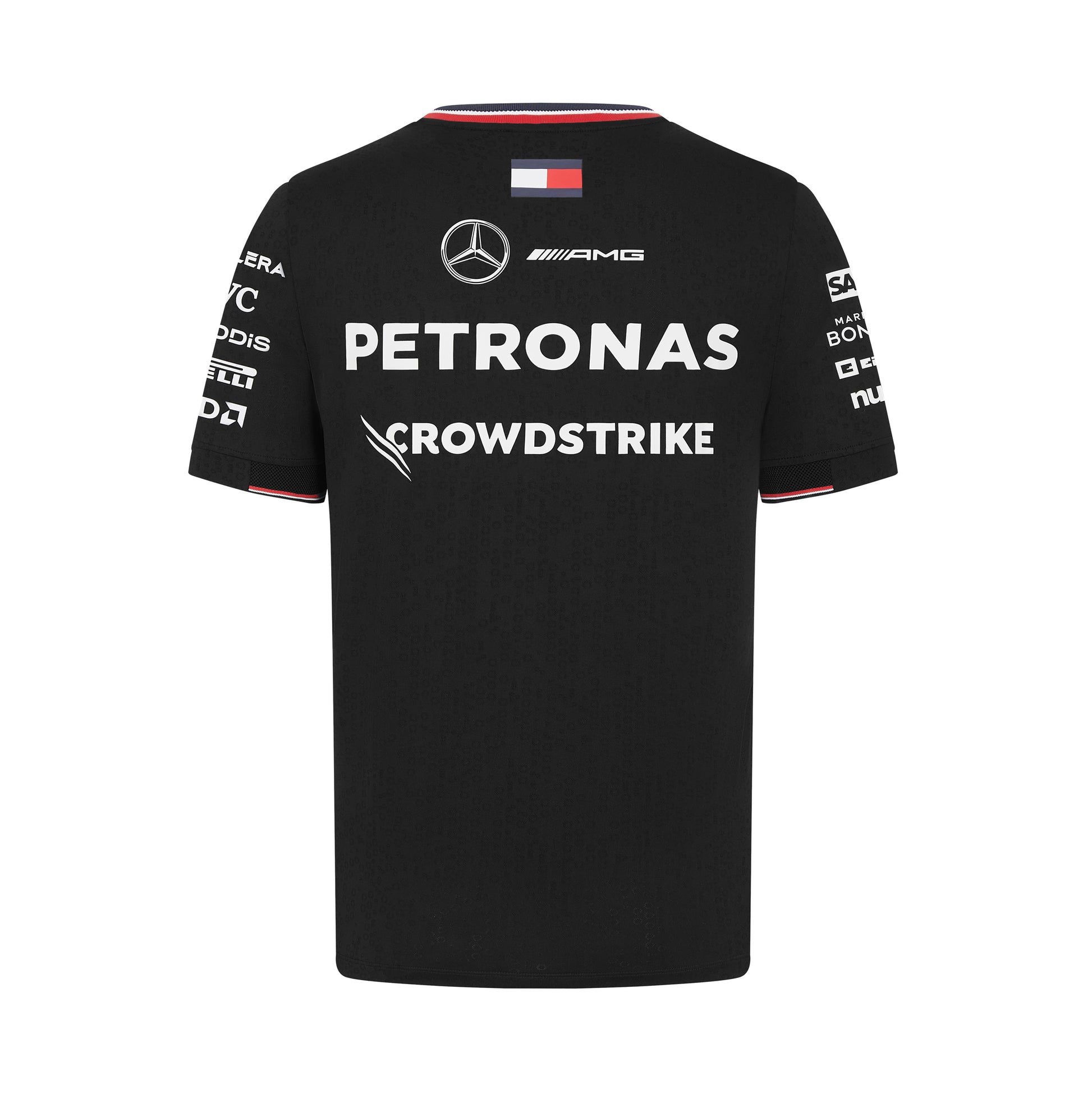 Official Mercedes AMG Petronas F1 Team Driver T-shirt. Available in Black or White and as worn by the Mercedes F1 Team during the 2024 F1 World Championship. Classic crew neck Mercedes F1 tee with team and partner logos.