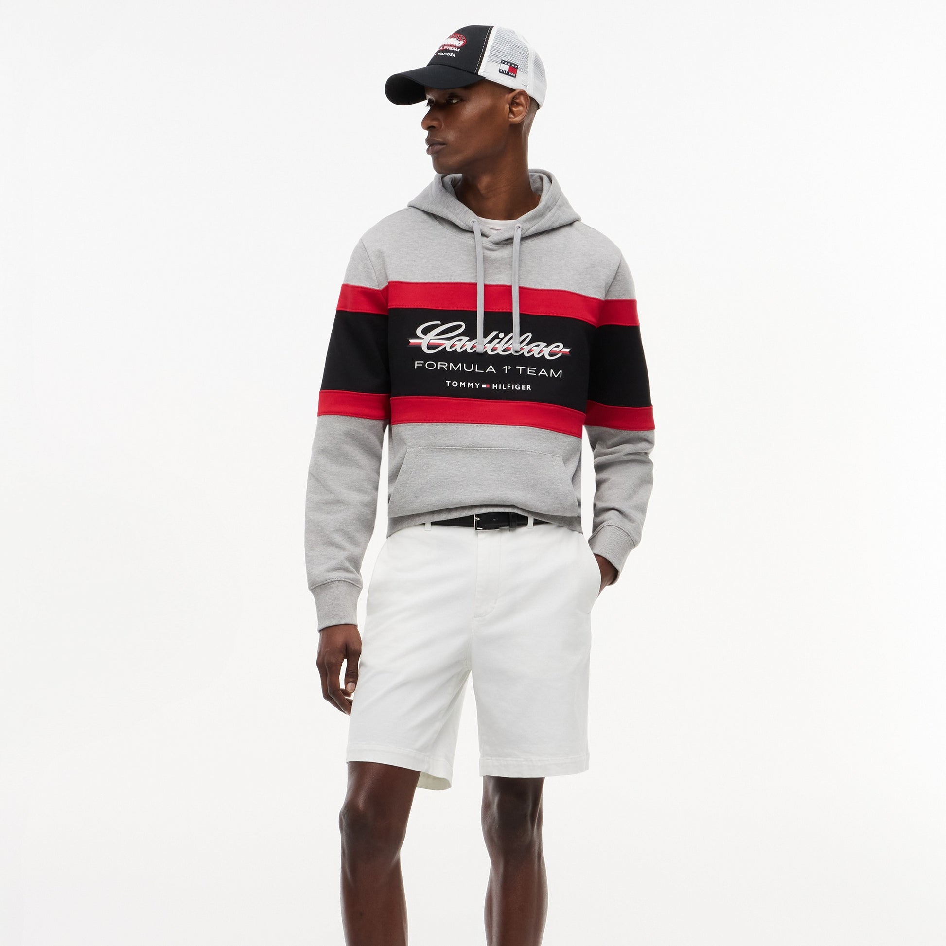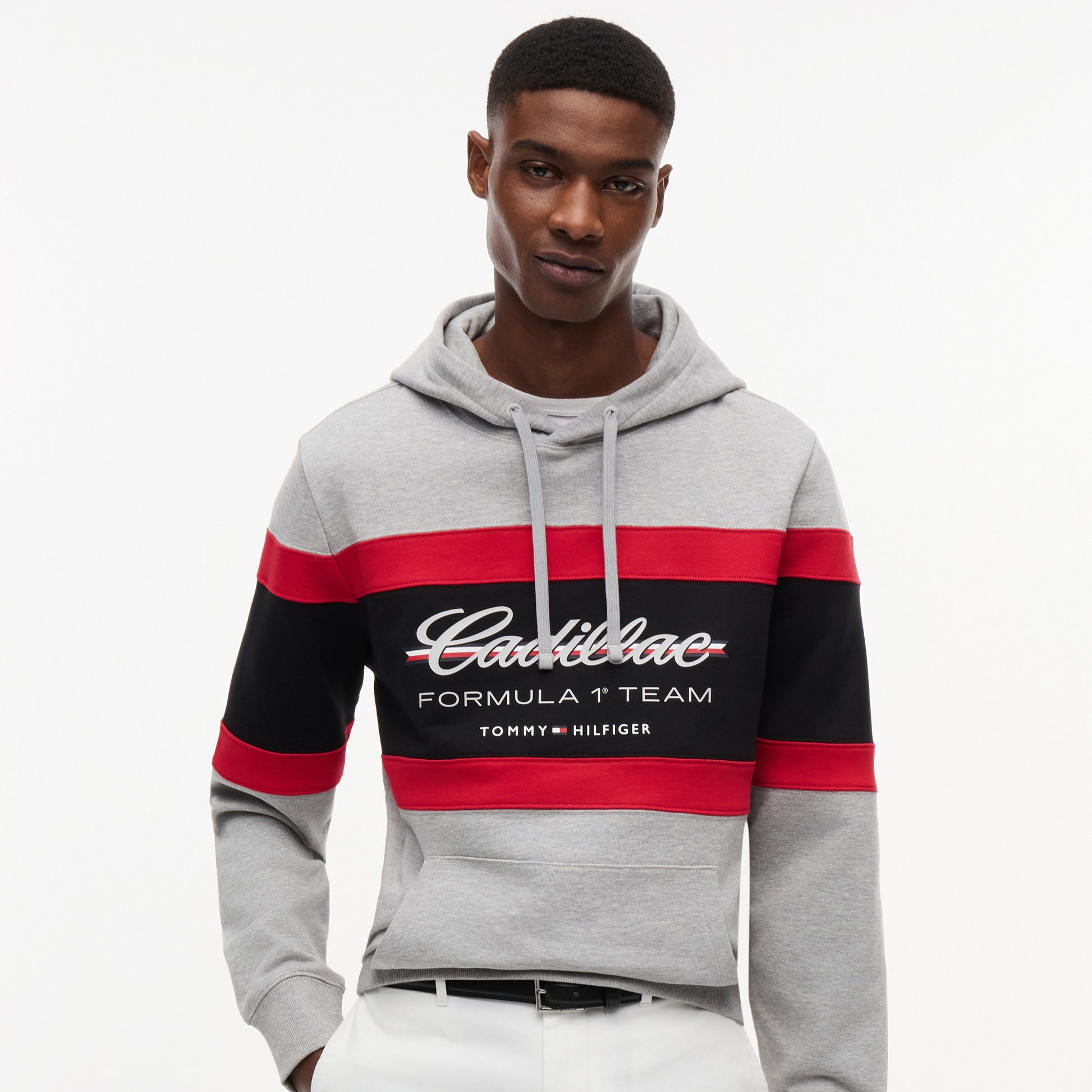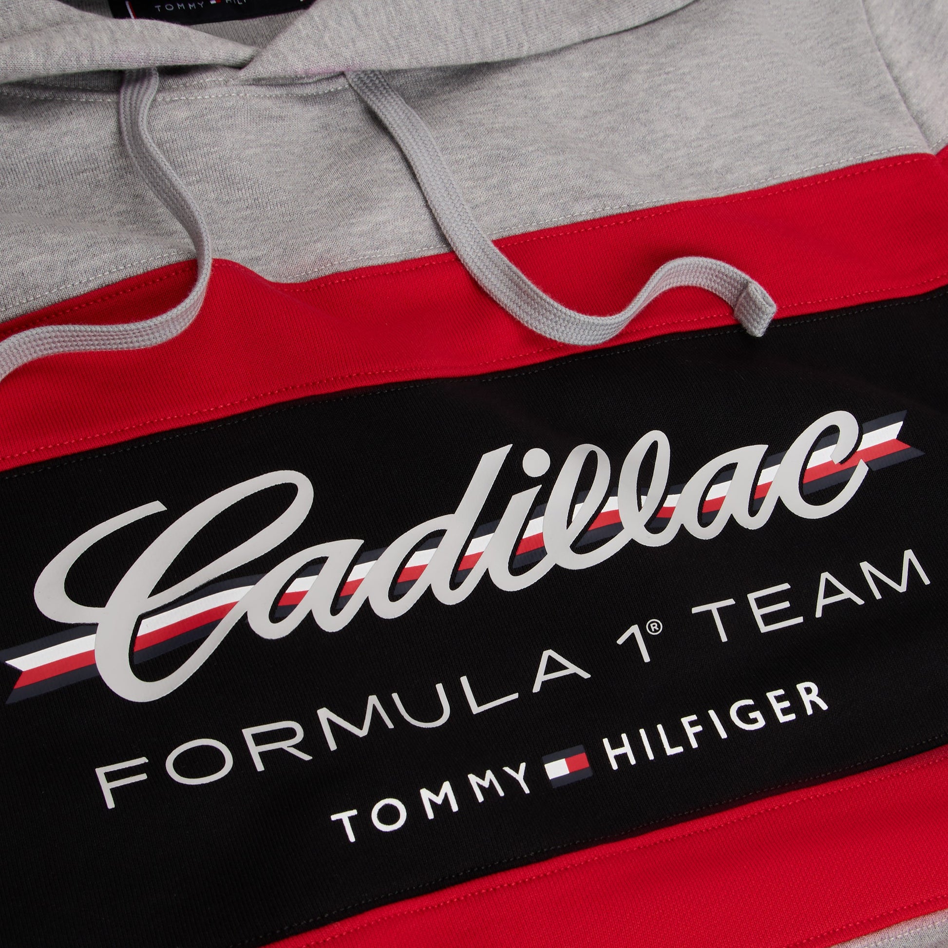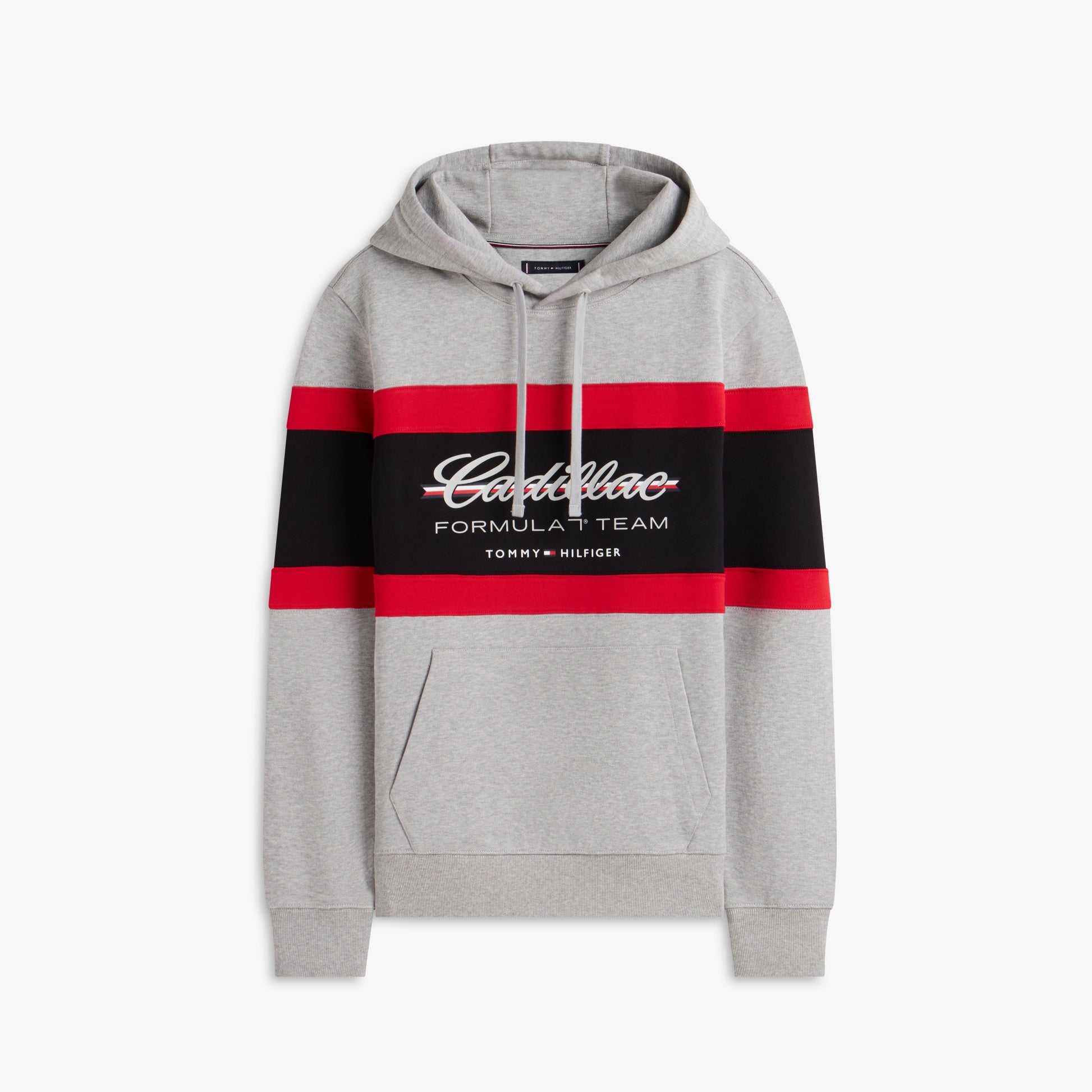 Stay comfortable with motorsport style in the Cadillac F1 x Tommy Hilfiger Panelled Hoodie for Men in light grey heather. This premium men’s hoodie blends bold panelled design with iconic Tommy Hilfiger x Cadillac Formula 1 Team branding for standout casual appeal.