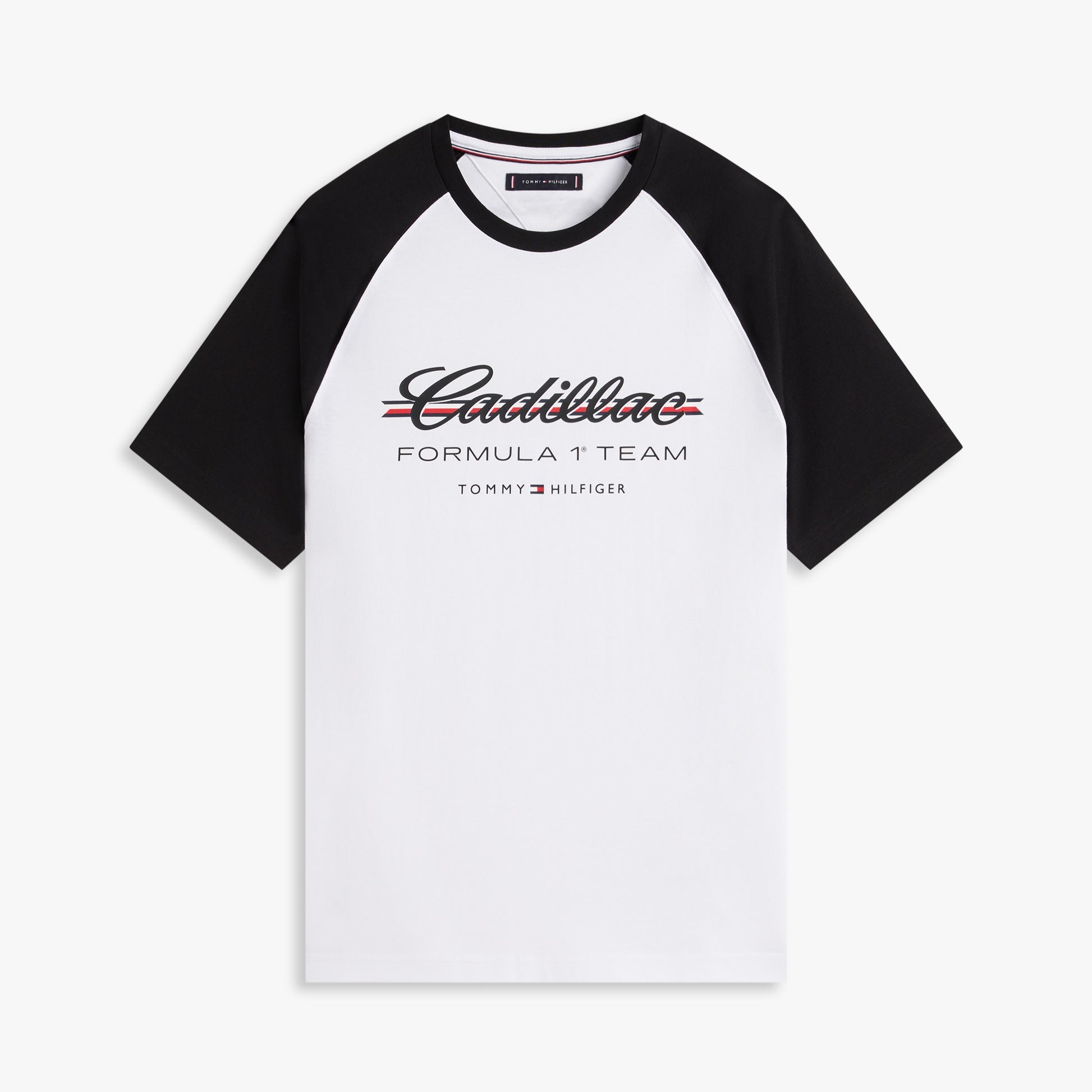 Show your American motorsport allegiance with the Cadillac F1 x Tommy Hilfiger Ringer Tee for Men in classic white with black trim. This premium men’s T‑shirt blends retro ringer style with bold Tommy Hilfiger x Cadillac Formula 1 Team branding for a standout, sporty look.
