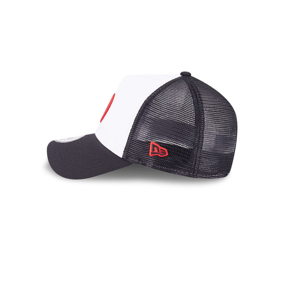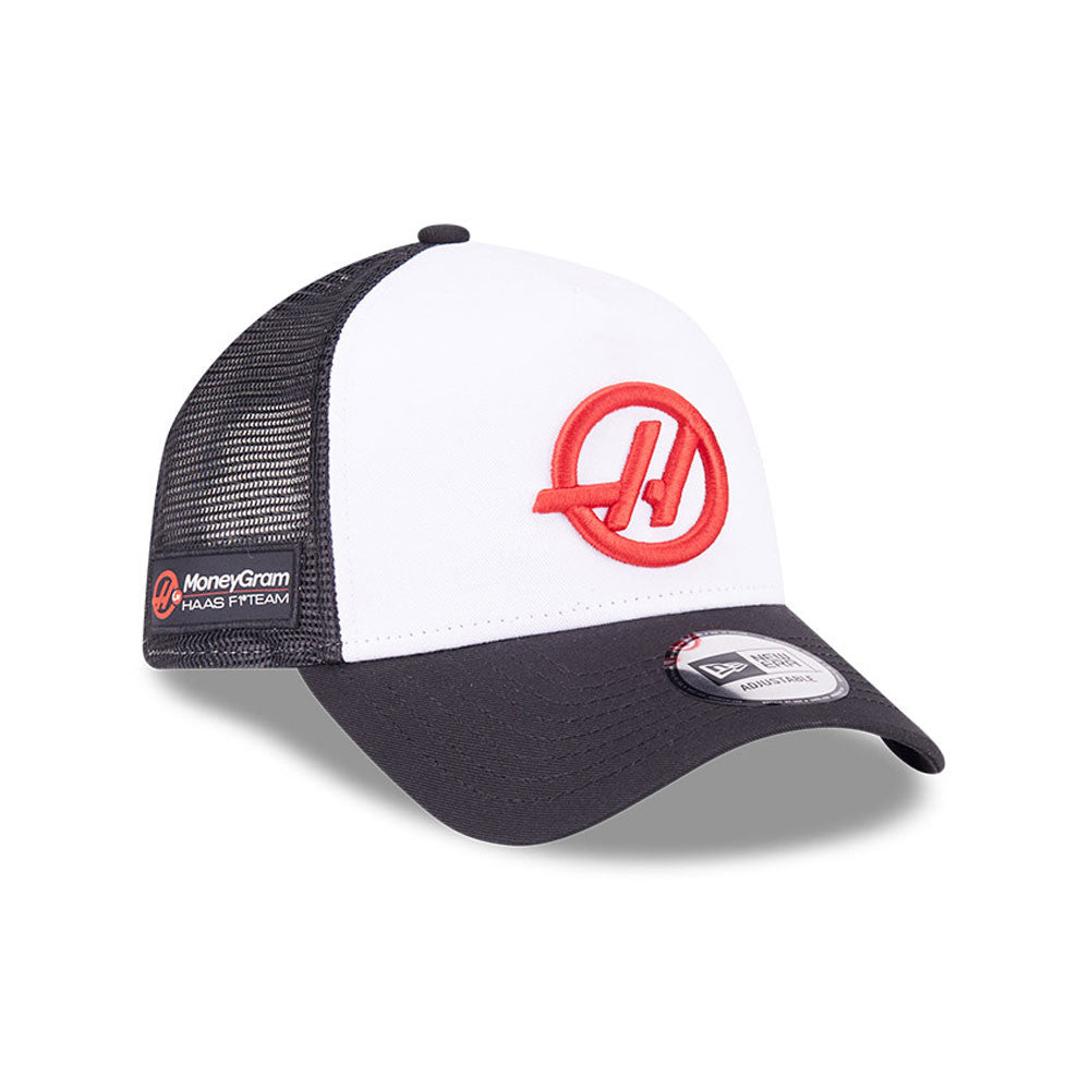 Super clean Haas F1 Team trucker with pure white front panel, black Haas F1 Team logo, matching peak and rear trucker mesh. One of our favourites