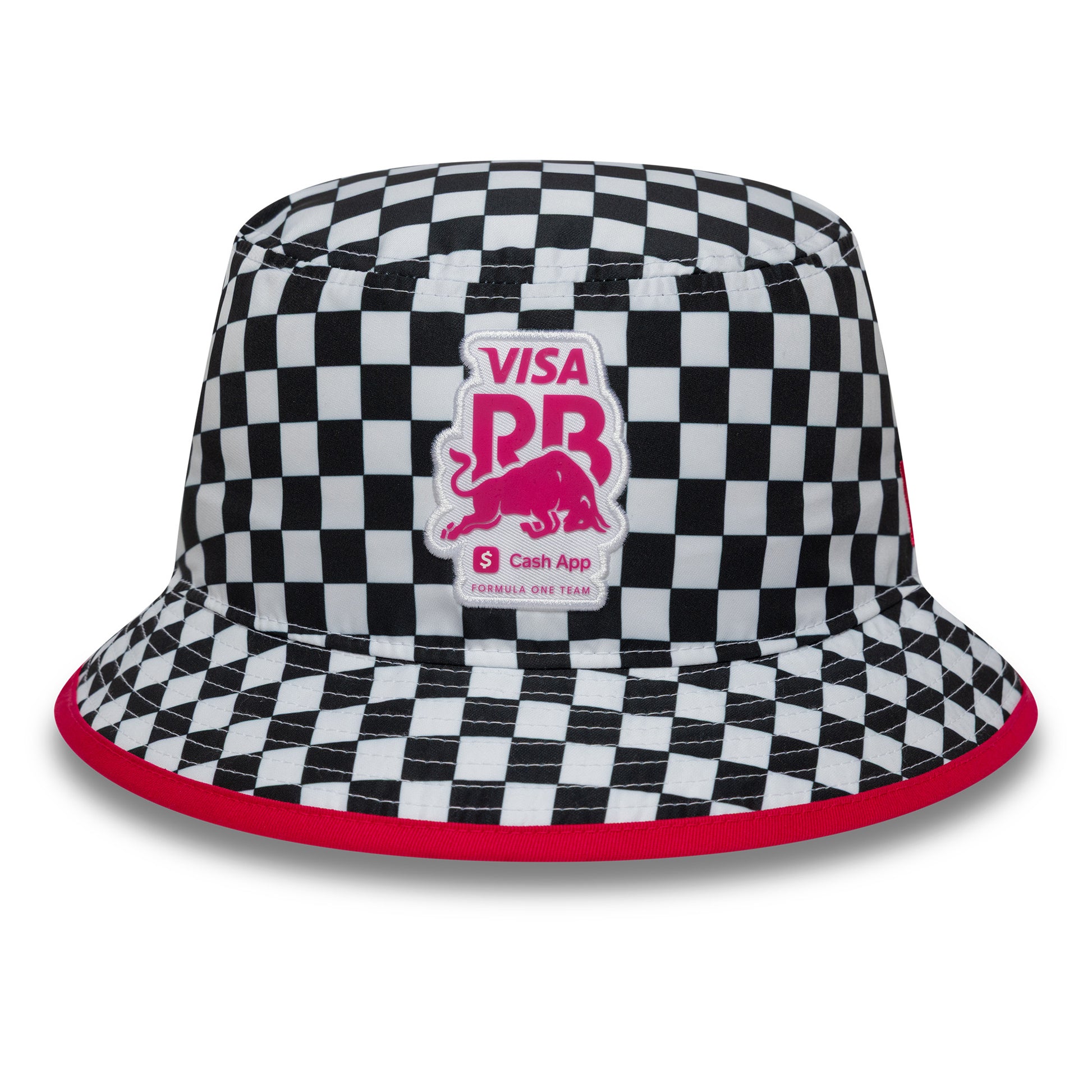 The Visa Cash App Racing Bulls Checkerboard Tapered White Bucket Hat combines sporty style with casual comfort.